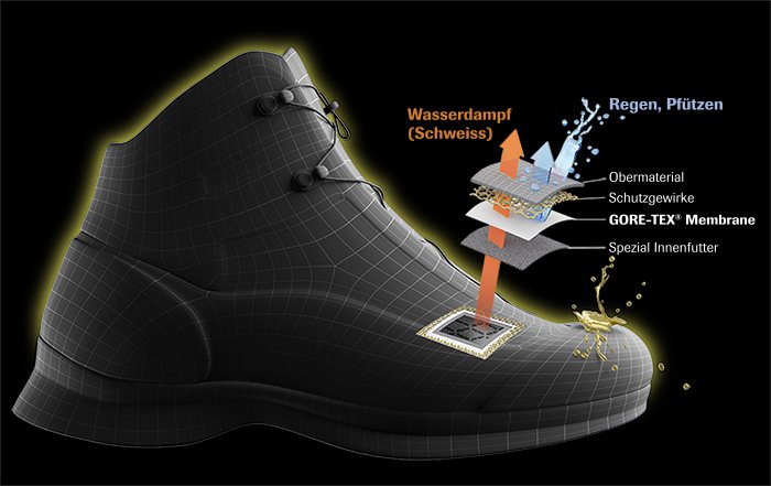 Gore-Tex ist wasserdicht und atmungsaktiv und hält die Füße dauerhaft trocken und angenehm durch die Fähigkeit, Schweiß nach Außen abzuleiten.