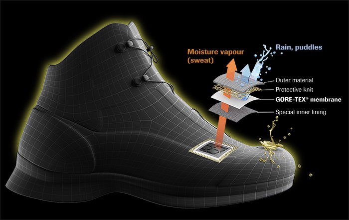 Membrana GORE-TEX ma mikroskopijne pory, 20 000 razy mniejsze od kropli wody, ale 700 razy większe niż cząsteczki pary wodnej. Ta unikalna kombinacja nie pozwala na przedostanie się wody do wnętrza buta i jednocześnie umożliwia odprowadzanie pary wodnej.